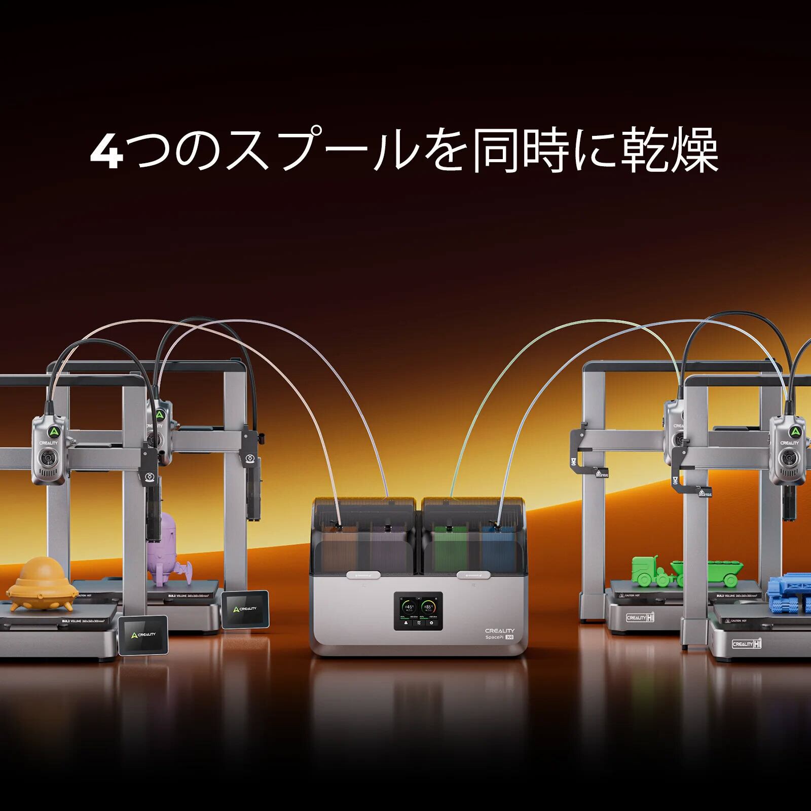 複数フィラメントを同時に乾燥・管理可能。マルチカラー印刷や連続造形も効率的にサポートします。