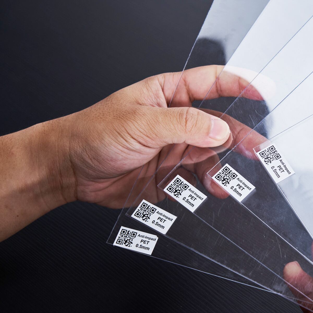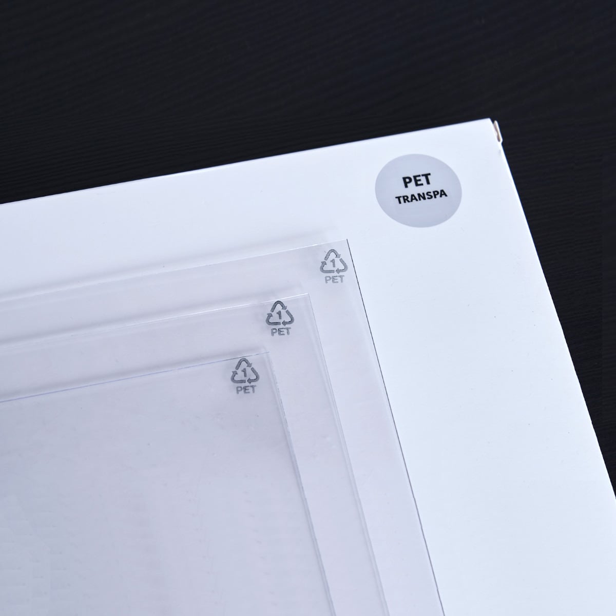PET(ポリエチレンテレフタレート)は、80%再生ペットボトルから作られ、高い透明性と耐衝撃性を持ち、型などの高い透明性と高い衝撃性が要求される用途に適しています。